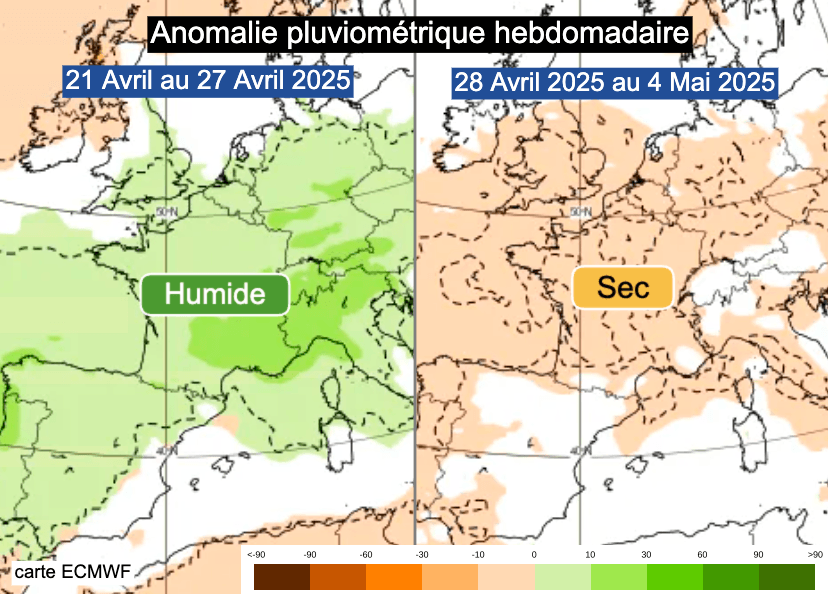 Anomalies pluviométrique hebdomadaires du 21 au 27 avril 2025 et du 28 avril au 4 mai 2025 - ECMWF