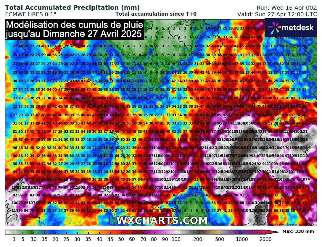 Modélisation des cumuls de pluie jusqu'au dimanche 27 avril 2025 (modèle européen du 16/04/25) - wxcharts.com