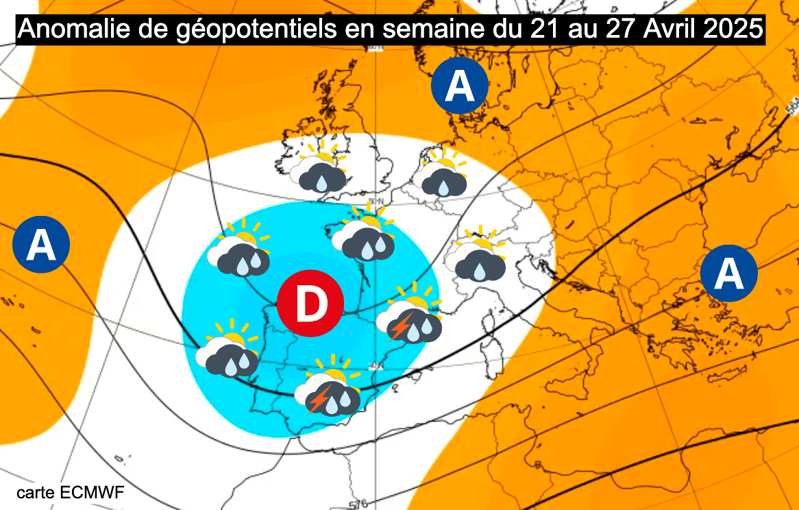 Anomalie de géopotentiels en semaine du lundi 21 au dimanche 27 avril 2025 - ECMWF