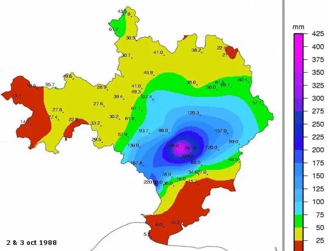 Cumuls de précipitations lors de l'épisode orageux du 2/3 octobre 1988 dans le Gard - Archives Météo-France