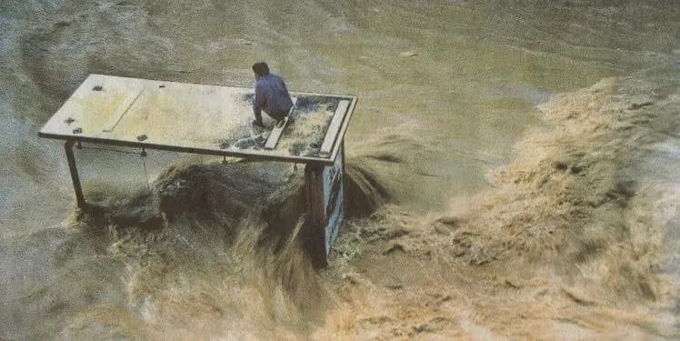 Un habitant se réfugie sur un abri bus pour éviter les torrents de boue en plein Nîmes en matinée du 3 octobre 1988 - Archives Météo-Villes