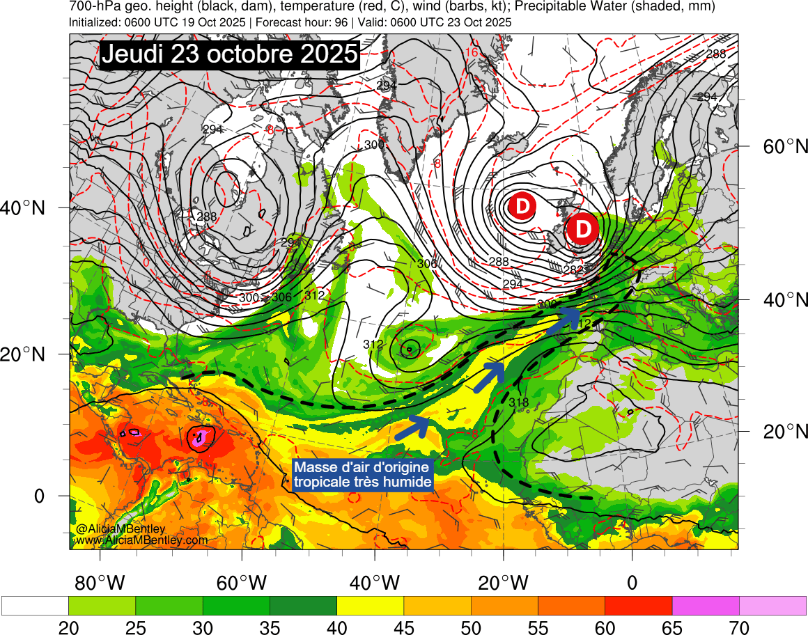 Masse d'air très humide venant des tropiques cette semaine sur l'Europe et la France – Via Atmos.albany.edu