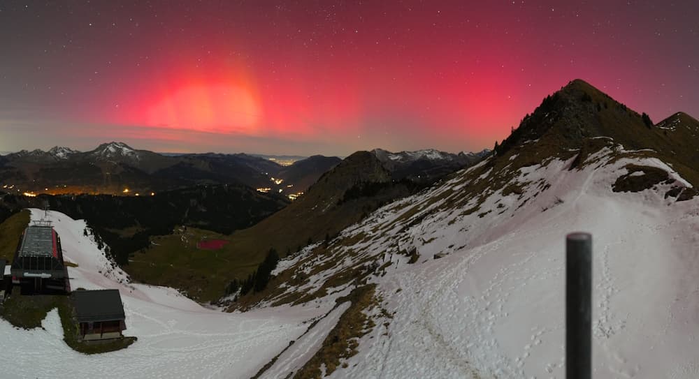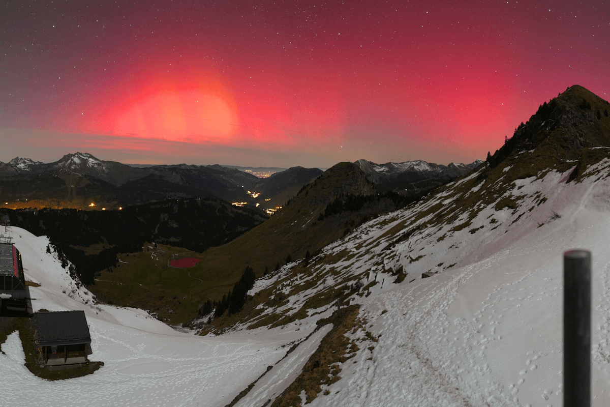 Avec très peu de pollution lumineuse, la montagne offre de superbes conditions d'observation des aurores boréales. La nuit dernière, de superbes couleurs ont pu être observées depuis les sommets des Alpes, comme le montre le cliché ci-dessous pris en haut du domaine de Morzine en Haute-Savoie. En plus du rose, quelques bandes jaune/orangé ont pu être observées.