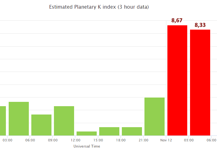 Kp index par pas de 3h, atteignant un pic à 8,67 cette nuit du mercredi 12 novembre 2025 - SWPC