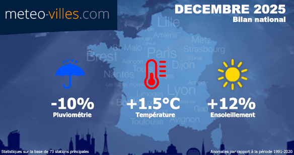 Comme à chaque début de mois, nous vous proposons un nouveau bilan climatologique. Place désormais au bilan cartographié de DÉCEMBRE 2025 en termes de température, pluviométrie et ensoleillement sur un panel de 73 stations*. Les anomalies présentées sont calculées à partir des moyennes climatiques de la période de référence 1991-2020 sur l'ensemble des stations du panel.