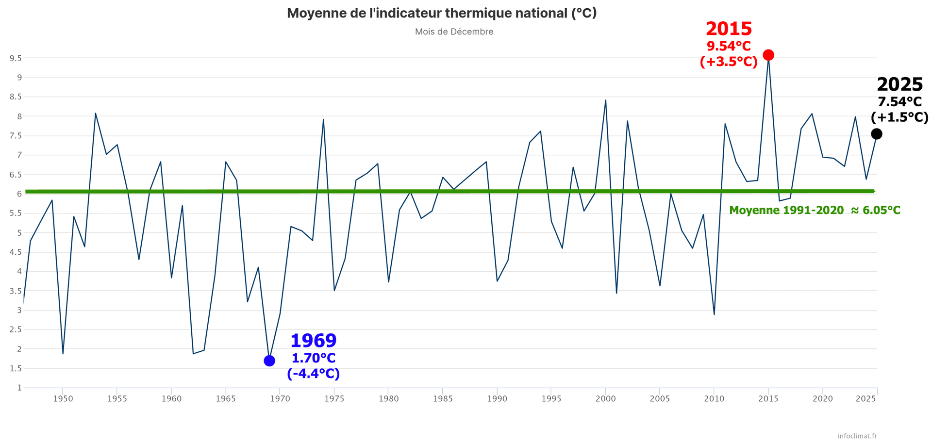 Indicateur thermique national pour décembre 2025 depuis l'après-guerre (1946) - Infoclimat