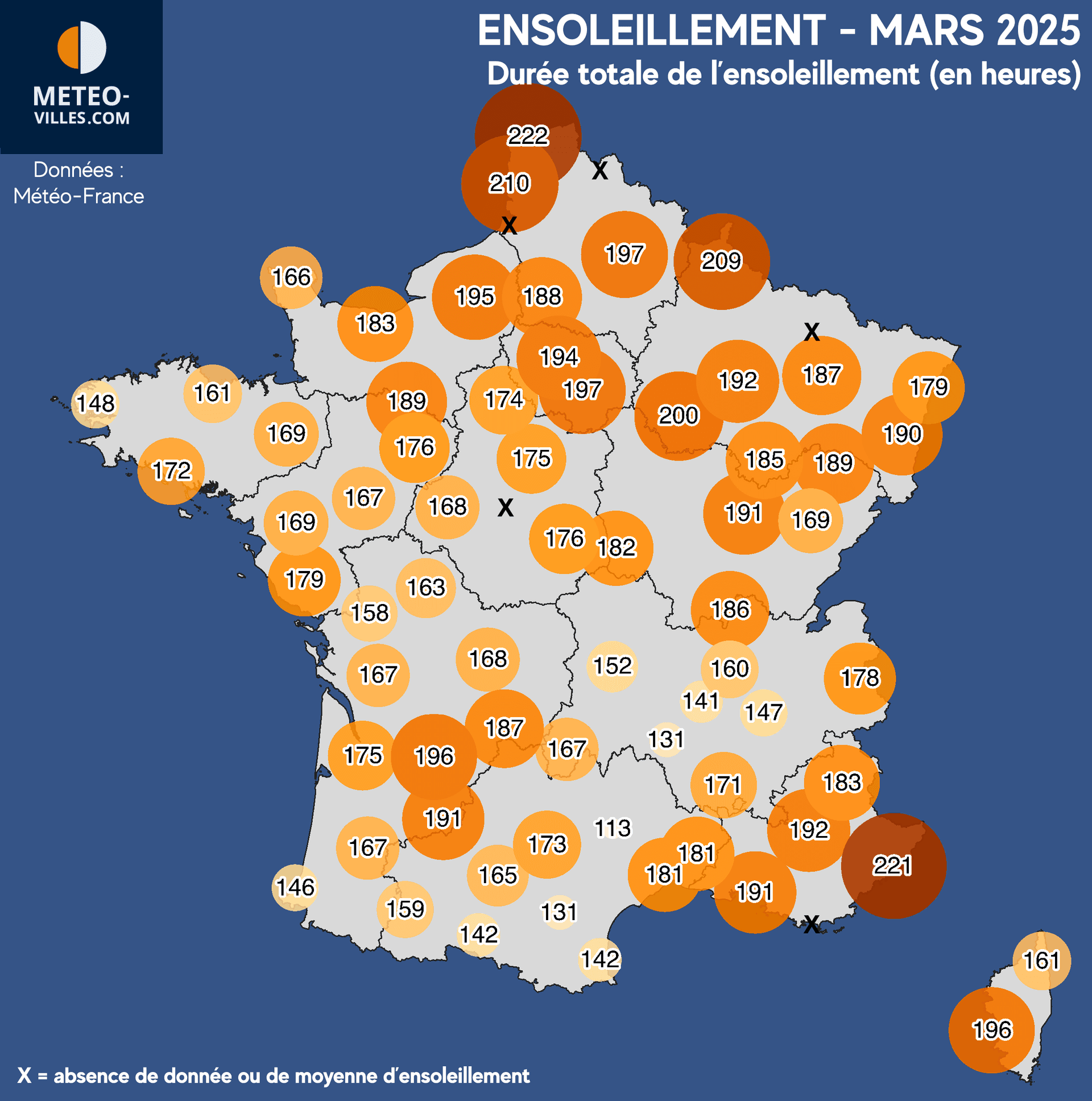 Car les régions les plus sèches ont été également les plus ensoleillées au cours du mois. Après un hiver bien gris et morose, le soleil a été omniprésent au cours de ce mois de mars au Nord de la Loire, dépassant partout les +20%. Au Nord de la Seine (Bassin-Parisien, Normandie, Hauts-de-France, Champagne-Ardennes), cet ensoleillement a même été remarquable, de quoi atteindre un excédent de +40 à +60% selon les villes : jusqu'à +44% à Paris, +58% au Touquet, et même +63% pour les stations de Rouen et de Charleville-Mézières.