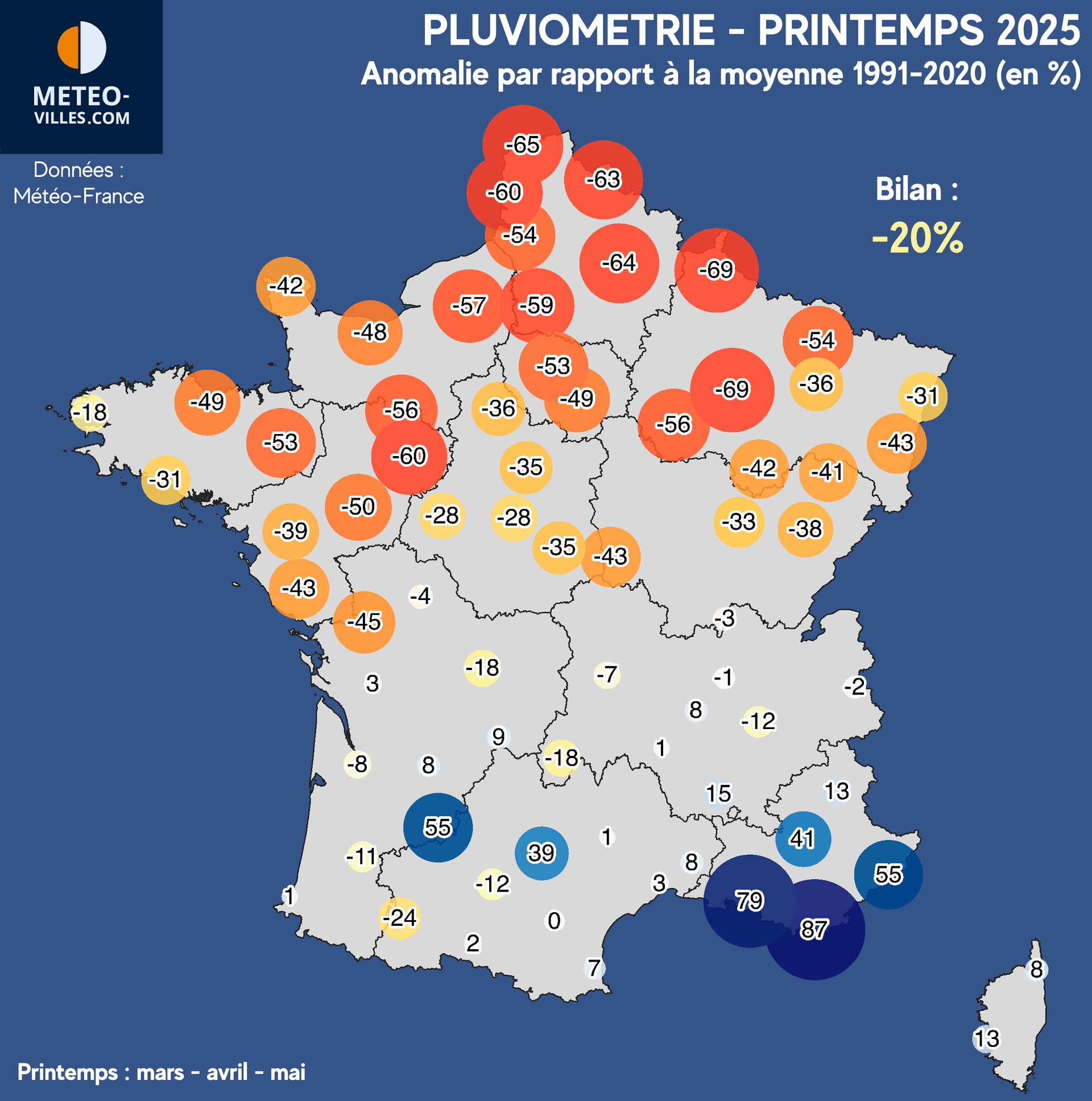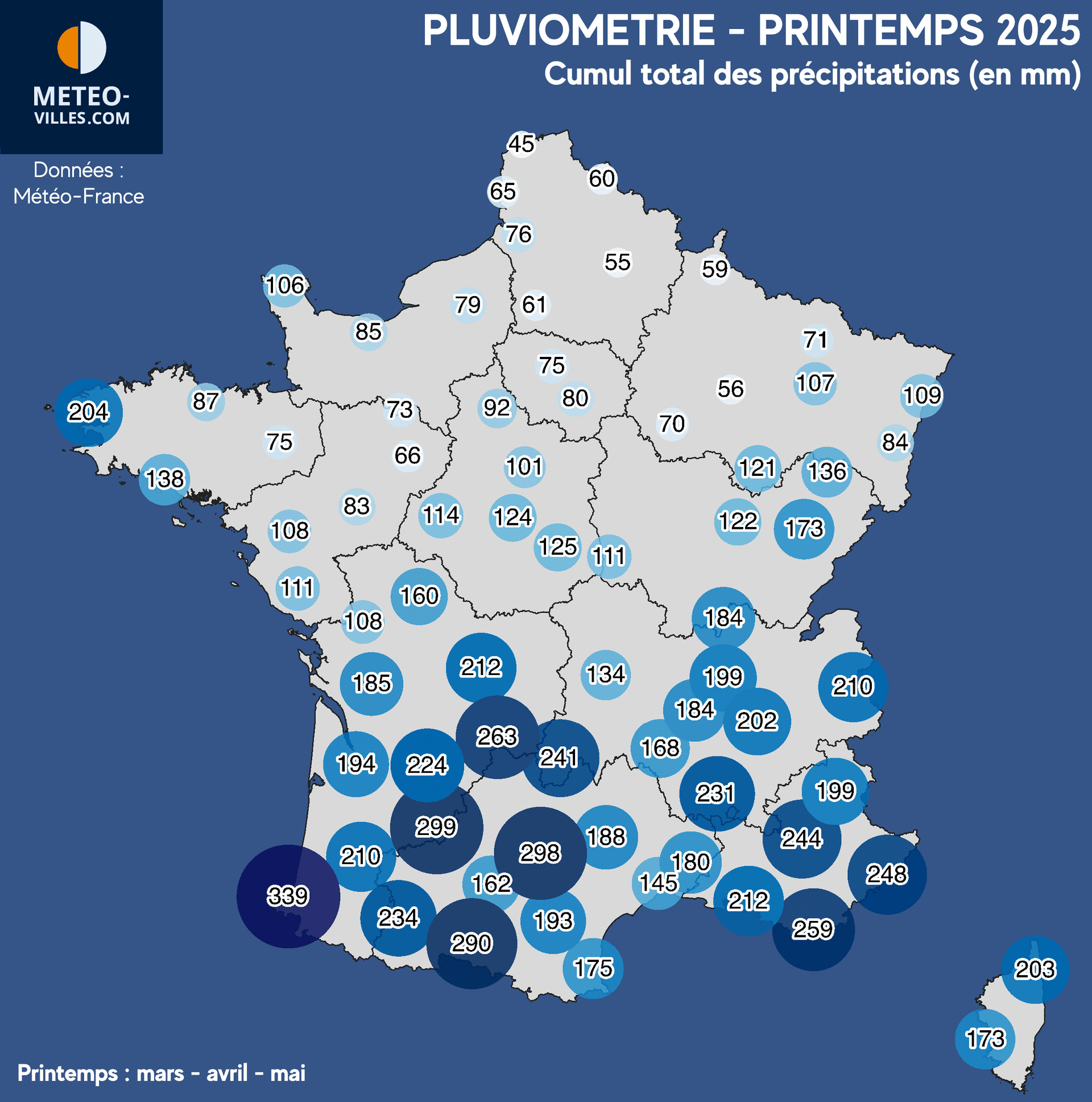 Voici le récapitulatif pluviométrique des trois mois du printemps météorologique 2025 sur notre panel de 73 stations :