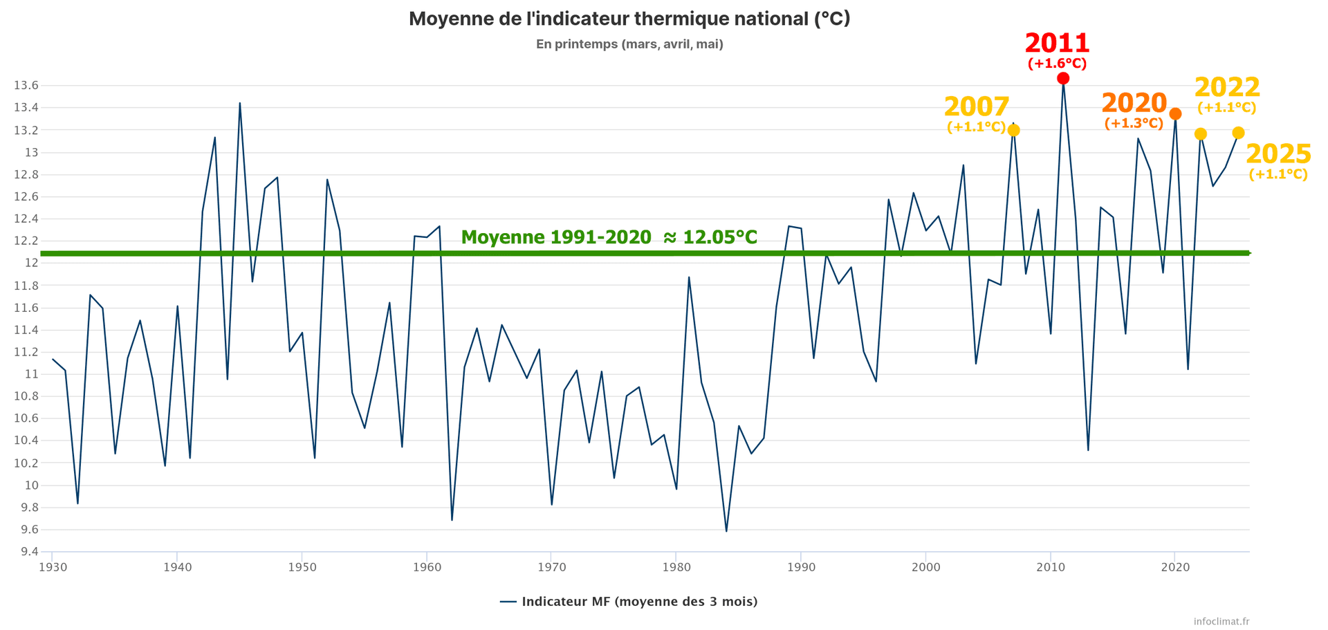 Indicateur thermique national pour le printemps météorologique depuis 1930 - Infoclimat