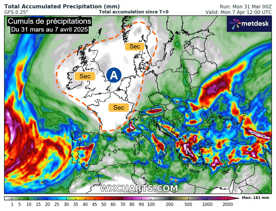 Cumuls de précipitations sur l'Europe du 31 mars au 7 avril 2025 – Modèle GFS via WX CHARTS