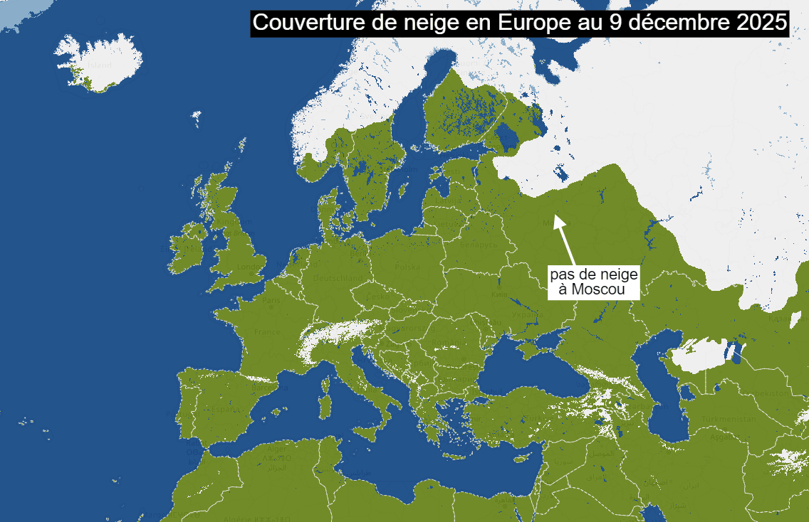 La conséquence directe de cette douceur qui règne en Europe est l'absence de manteau neigeux sur la majeure partie du continent. Il faut se rendre en Europe du nord, sur la partie nord de la Scandinavie ou l'Islande, pour retrouver des sols recouverts par la neige. Même l'ouest de la Russie n'est actuellement pas enneigé. C'est le cas de la capitale Moscou, où la neige est encore absente en date du 9 décembre 2025. Avec des prévisions restant douces pour les semaines à venir, la neige va très peu progresser sur le continent.