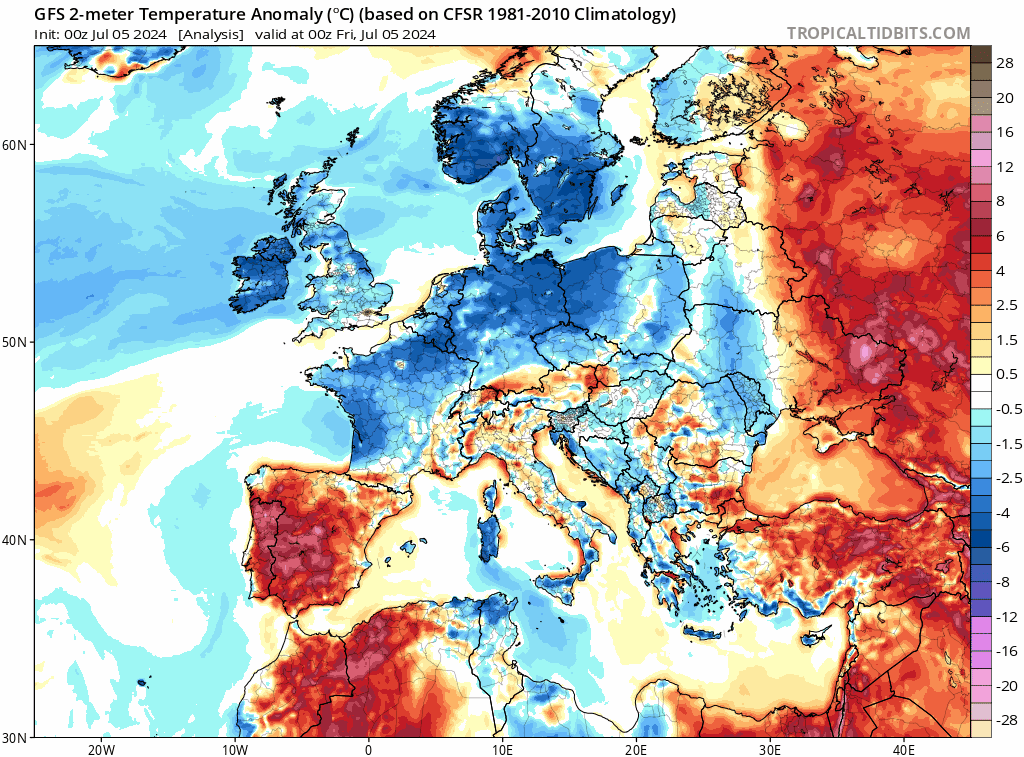 Anomalies de températures à 2m sur l'Europe du 5 au 8 juillet 2024 – Via TropicalTidBits