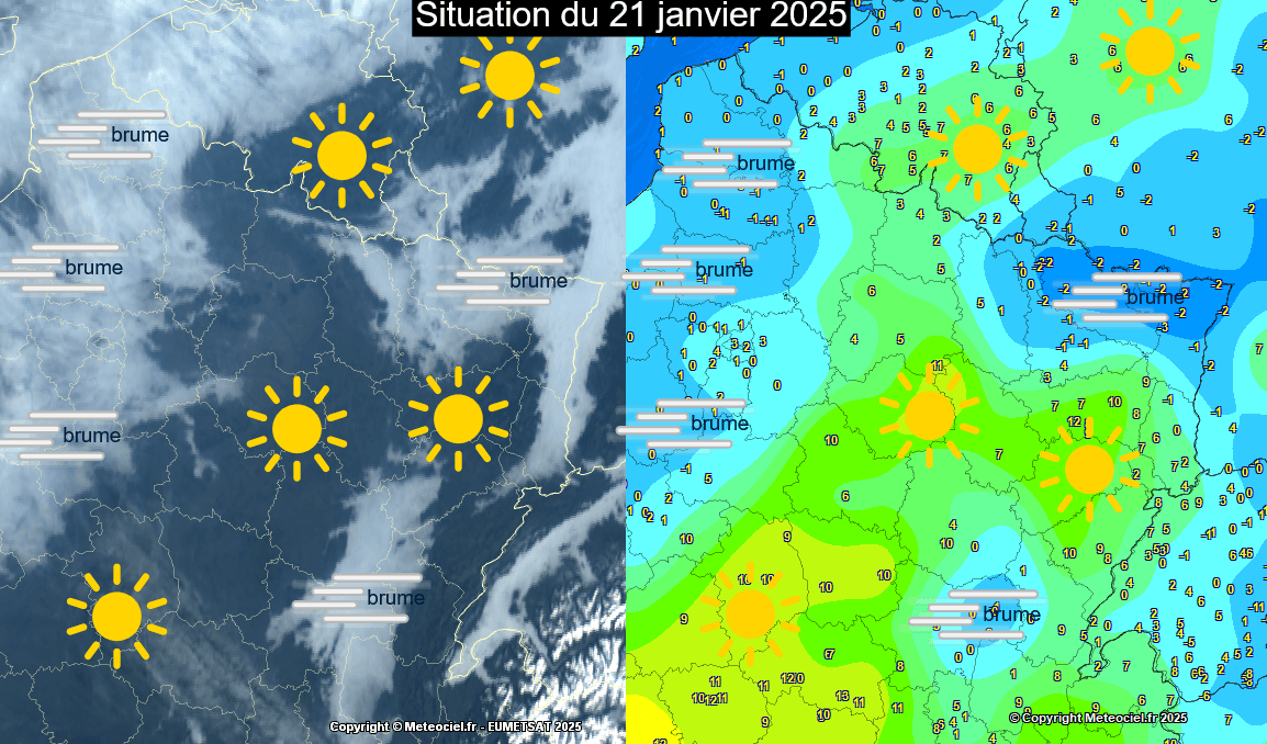 Ainsi, ces variations de quelques % à peine de l'humidité relative peuvent à elles seules sceller le sort d'une journée entière. Les températures observées sous les stratus et le brouillard peuvent rester sous 0°, tandis que l'on dépassera allègrement les +10°C sous un superbe soleil quelques kilomètres plus loin.