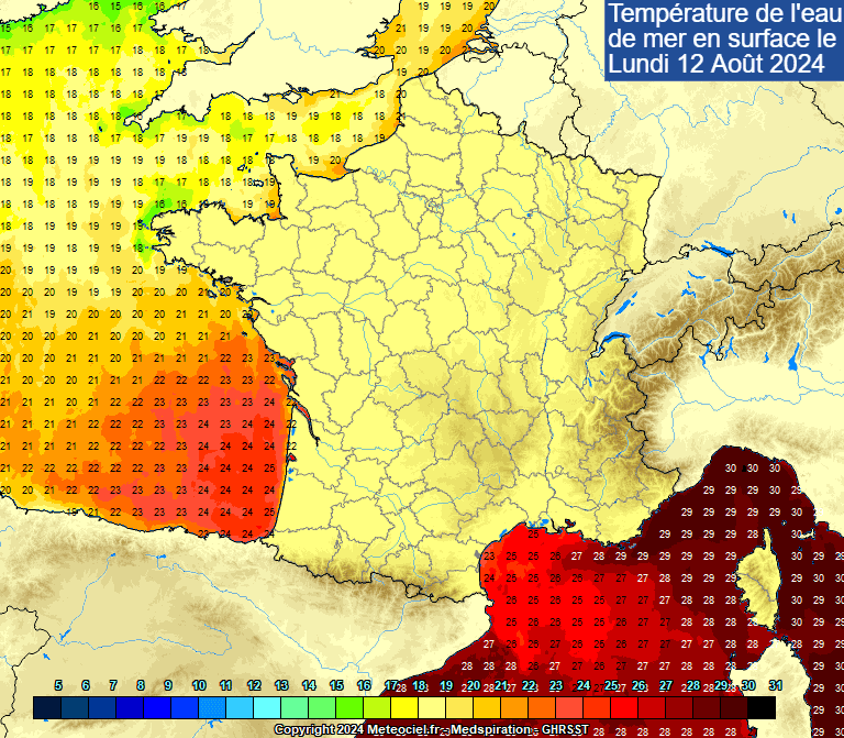 Températures de l'eau de mer en surface le lundi 12 août 2024 - meteociel.fr