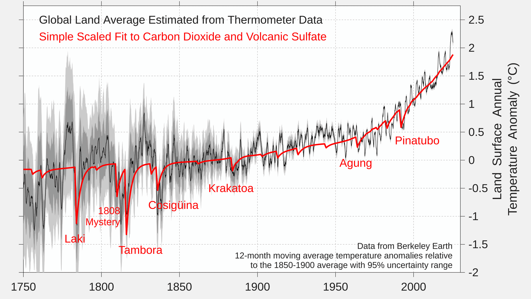 Évolution de la température mondiale de 1750 à 2025 ave conséquences des éruptions volcaniques majeures - via Berkeley Earth
