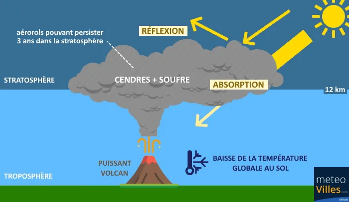 Schéma du refroidissement climatique engendré par une violente éruption volcanique - Météo Villes
