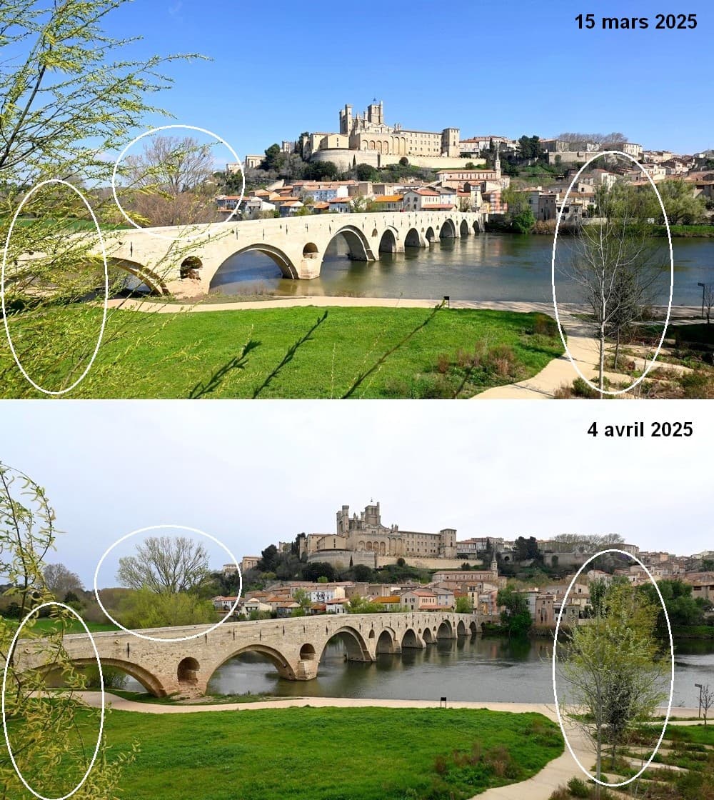 Évolution de la nature entre le 15 mars et le 4 avril 2025 à Béziers – via Skaping