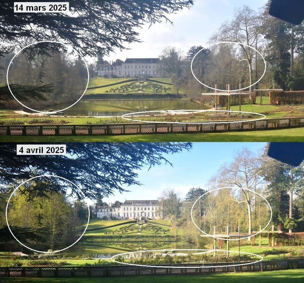 Évolution de la nature entre le 14 mars et le 4 avril 2025 au Parc Floral d'Orléans – via Skaping