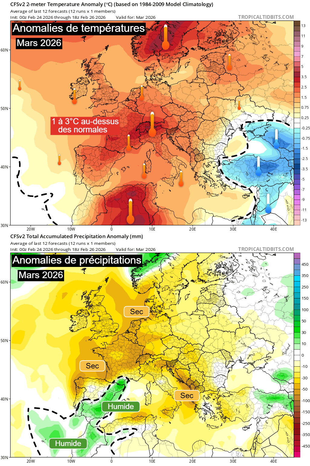 Pour le moment, la majorité des modèles saisonniers s'accordent sur le fait que le mois de mars devrait se montrer plus doux que la normale sur la France mais également plus sec. Les anomalies de températures restent en effet positives sur la France tout comme sur une large partie de l'Europe alors que les anomalies de précipitations restent négatives sur la majorité du pays, excepté près de la Méditerranée où le temps pourrait se montrer plus régulièrement humide.