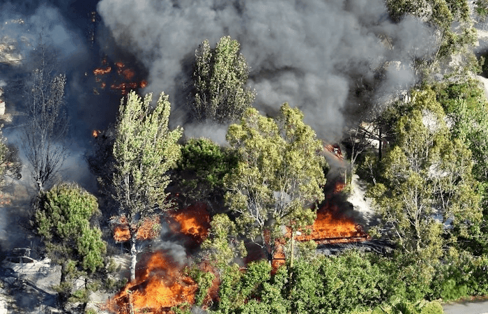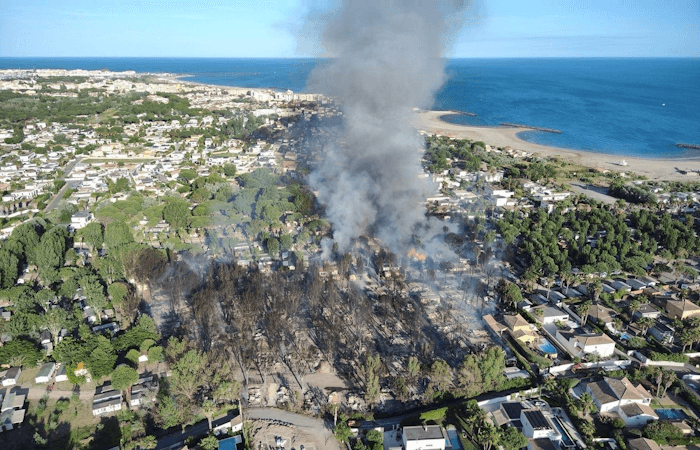 L'incendie s'est déclaré durant l'après-midi du mardi 27 mai 2025. Les flammes ont touché un camping du Cap d'Agde dans le département de l'Hérault. Elles se sont propagées à plusieurs allées, détruisant quelques dizaines d'arbres et 181 bungalows, comme l'illustre le cliché ci-dessous. Plusieurs centaines de vacanciers ont été évacués et ont été hébergés par la commune dans deux gymnases mis à disposition.