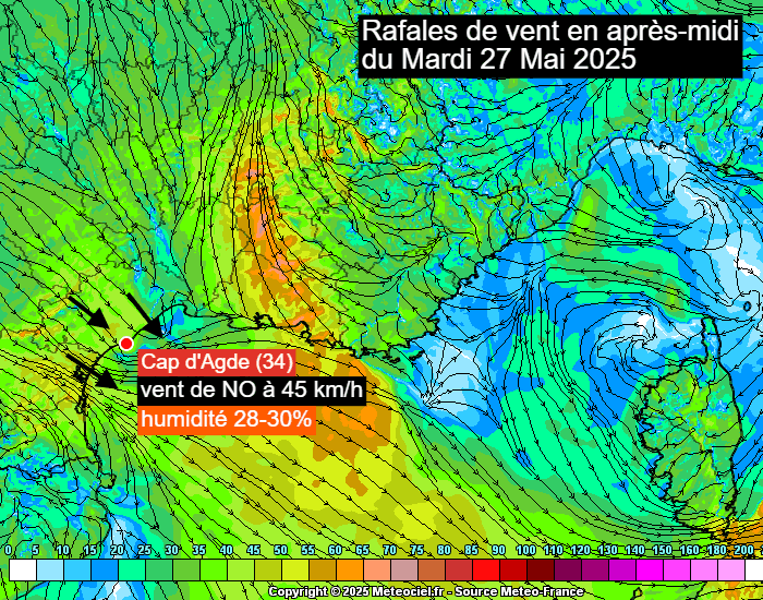 Rafales de vent en Méditerranée en après-midi du mardi 27 mai 2025 - meteociel.fr