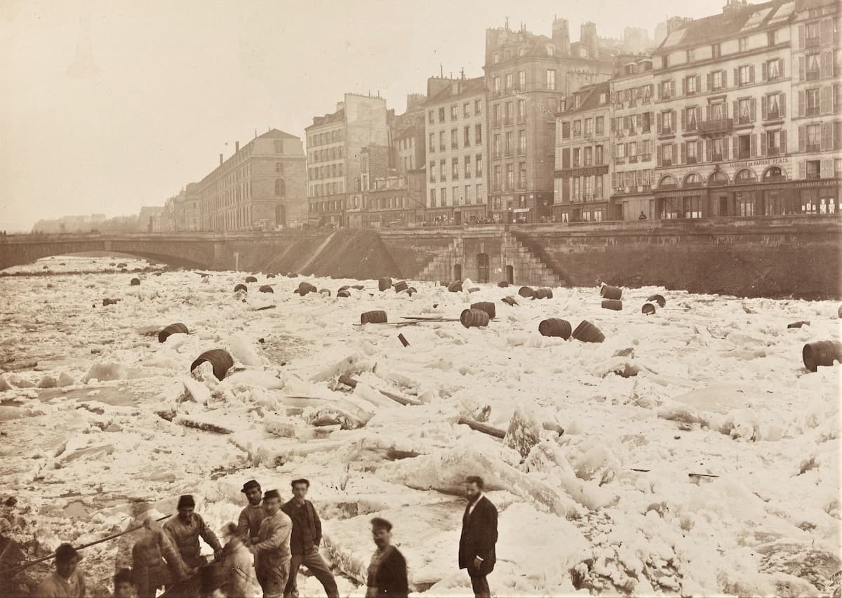 Comme la Loire, la Seine était complètement figée dans la glace, dont l'épaisseur était spectaculaire à la fin du mois de décembre 1879. Avec des températures s'envolant brutalement à +11°C, le fleuve se remet à couler début 1880. Les énormes glaçons entraînés par le courant s'accumulent contre les berges et les fondations des ponts, exerçant une pression et des chocs répétés. La structure du pont des invalides de Paris ne l'a pas supporté et il s'effondre le 3 janvier 1880.$