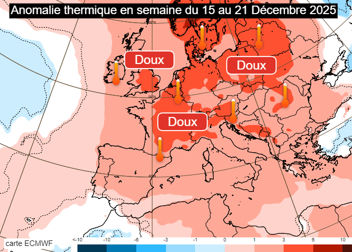 La douceur est bien installée et ne semble pas près de s'éloigner. La carte ci-dessous montre l'anomalie thermique modélisée pour la semaine prochaine, du 15 au 21 décembre 2025. On constate la poursuite de l'anomalie douce sur une grande partie de l'Europe, restant plus nette de la France jusqu'à la Scandinavie. Dans notre pays, l'anomalie thermique mensuelle devrait être de l'ordre de +2°C à +4°C, soit à peine moins que durant cette semaine du 8 au 14 décembre.