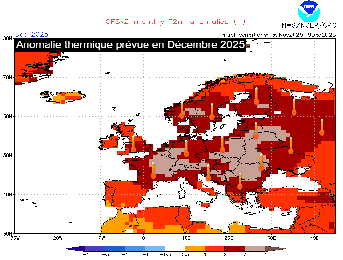 D'ailleurs, les dernières modélisations d'anomalie thermique sur l'ensemble du mois de décembre 2025 sont édifiantes ! Comme le montre la carte ci-dessous, une grande partie de l'Europe devrait enregistrer une anomalie thermique impressionnante, de l'ordre de +2 à +4°C de la France jusqu'à l'ouest de la Russie ! Autant dire que les sensations hivernales promettent d'être très discrètes au cours de ce mois de décembre sur le vieux continent...