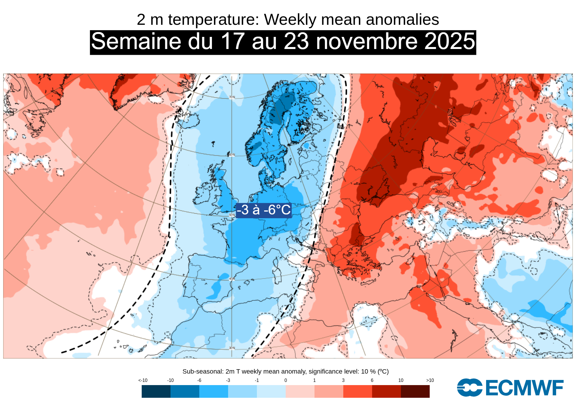 Anomalies de températures à 2m sur l'Europe pour la période du 17 au 23 novembre 2025 – ECMWF