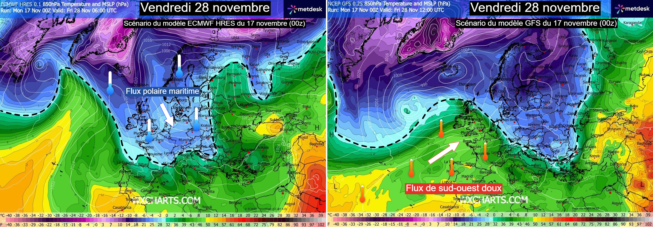 Différents scénarios pour la fin du mois de novembre – Modèles GFS et ECMWF via WX CHARTS