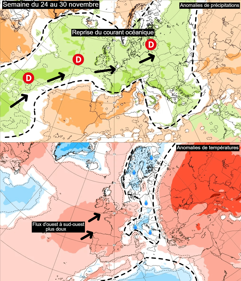 La situation pourrait néanmoins évoluer la semaine prochaine. En effet, les principaux modèles de prévisions envisagent en effet une reprise au moins temporaire du flux océanique sur notre pays, ce qui aurait pour effet de provoquer une nouvelle remontée des températures pour cette dernière semaine de novembre.