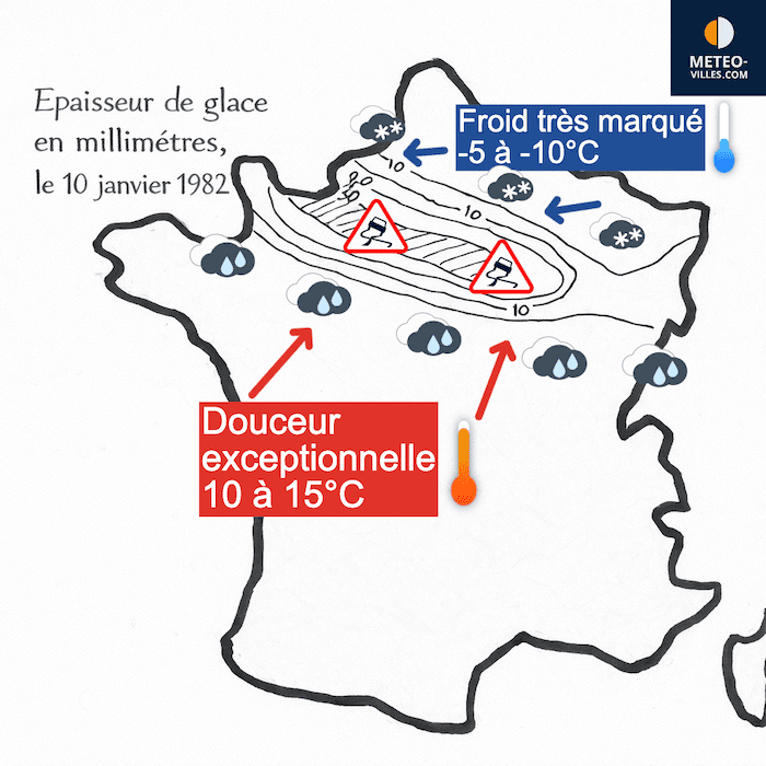 Début janvier 1982, une situation météorologique exceptionnelle se met en place. Une masse d’air froid massive recouvre l’Europe du Nord, tandis qu’une masse d’air exceptionnellement doux remonte d’Europe du Sud. La Normandie, l’Île-de-France et la Bourgogne se retrouvent au cœur de ce conflit de masses d’air, avec une différence de températures d’environ 20°C sur seulement 300 km !  Ce bras de fer entre l’air froid et l’air chaud est si intense que le front stationne sur ces régions pendant plusieurs jours, provoquant d’importantes précipitations sous forme de neige, de pluies verglaçantes ou de pluie.