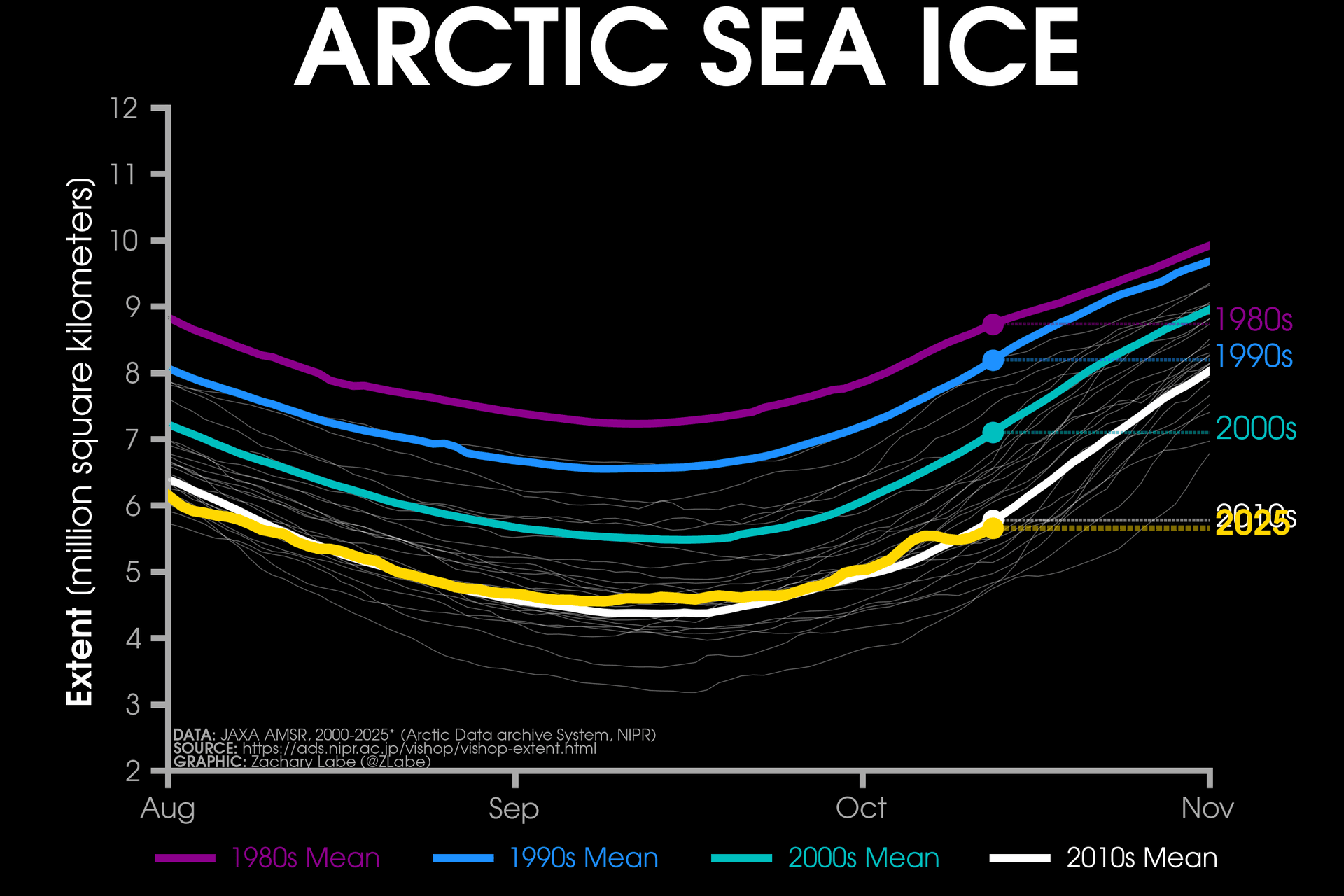 Comme l’indique le graphique ci-dessous, l’extension moyenne pour ce mois d’octobre 2025 se situe proche de celle observée durant la décennie 2010, et reste nettement supérieure aux records minimums atteints en 2012 et 2020.