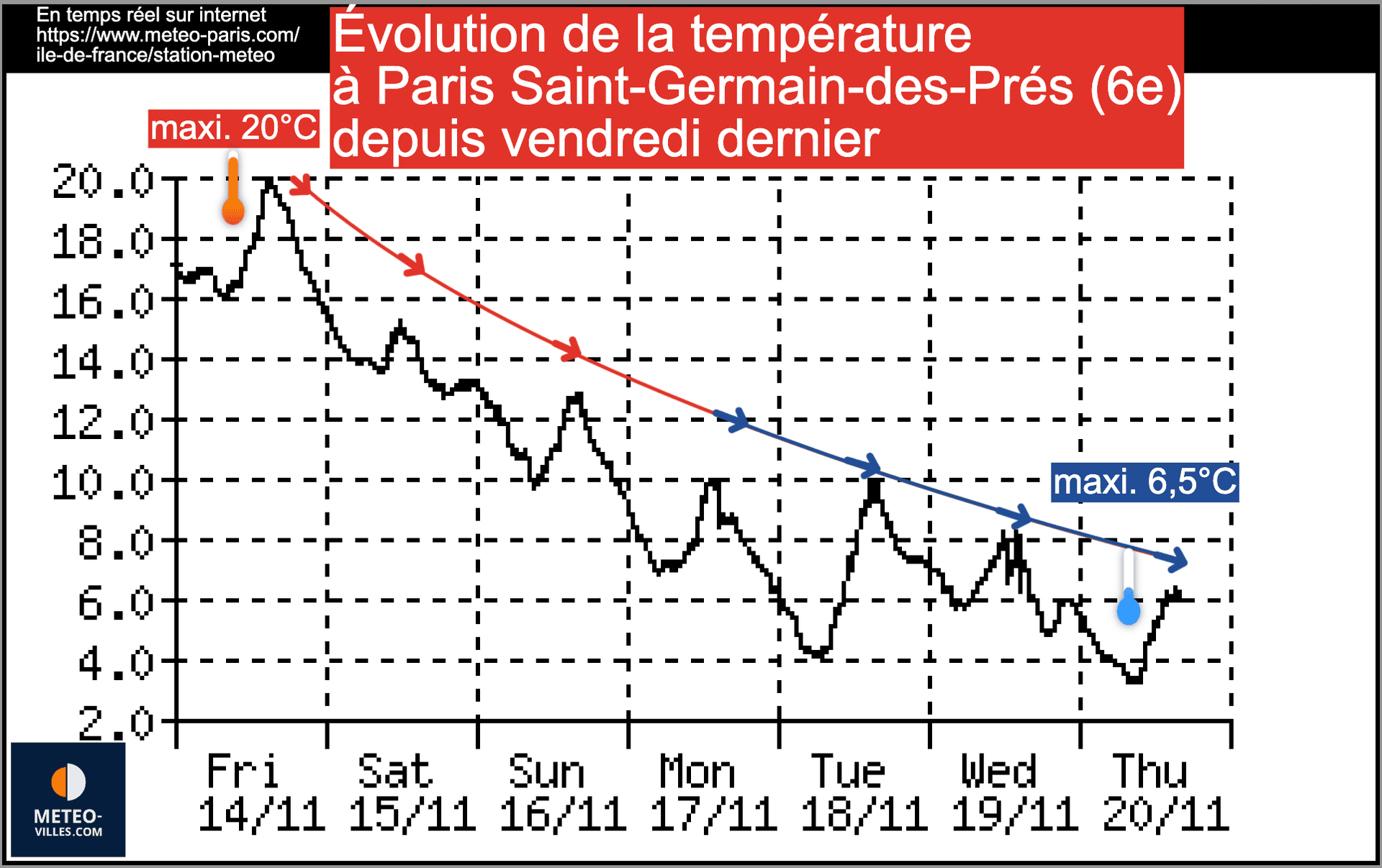 Avec la bascule du flux au nord, les températures ont en effet nettement baisse ces derniers jours, comme à Paris où on atteignait encore 20°C il y a une semaine et où il n'a pas fait plus de 6.5°C ce jeudi 20 novembre et plus de 4°C ce vendredi 21 novembre.