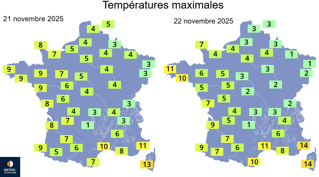 Températures maximales entre le 21 et le 22 novembre 2025 sur la France – Météo-Villes