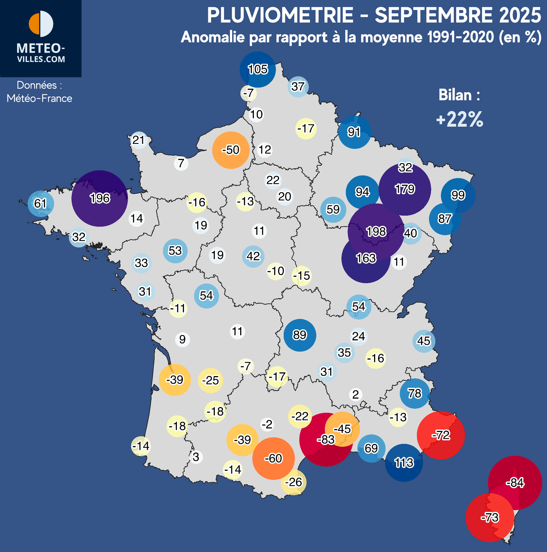 Côté précipitations, ce mois de septembre est bien entré dans l'automne avec une humidité bien présente. Sur notre panel de station, nous terminons sur un bilan excédentaire de +22%