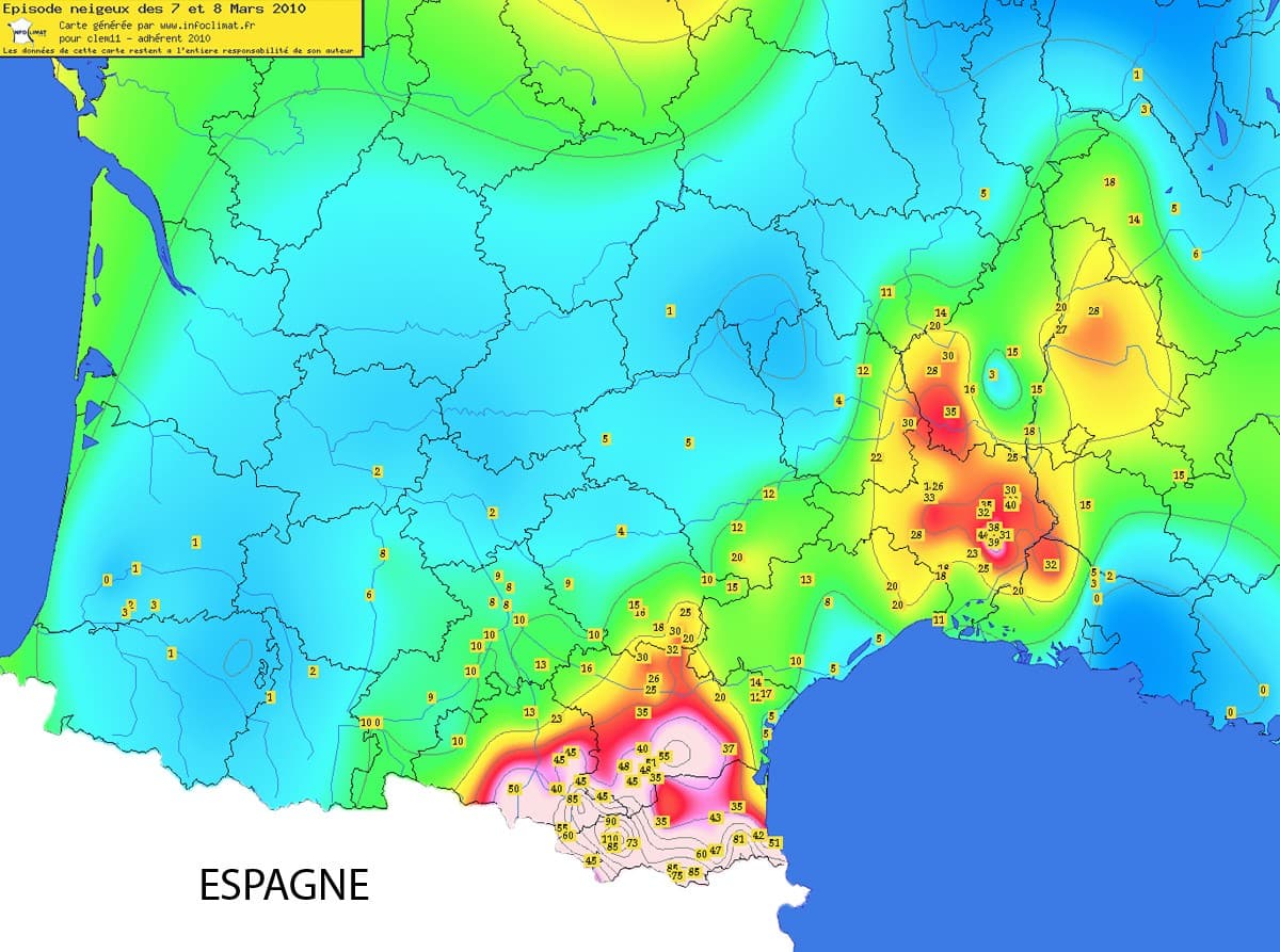 Cumuls de neige pour l'épisode des 7 et 8 mars 2010 sur le Sud de la France – Via infoclimat.fr
