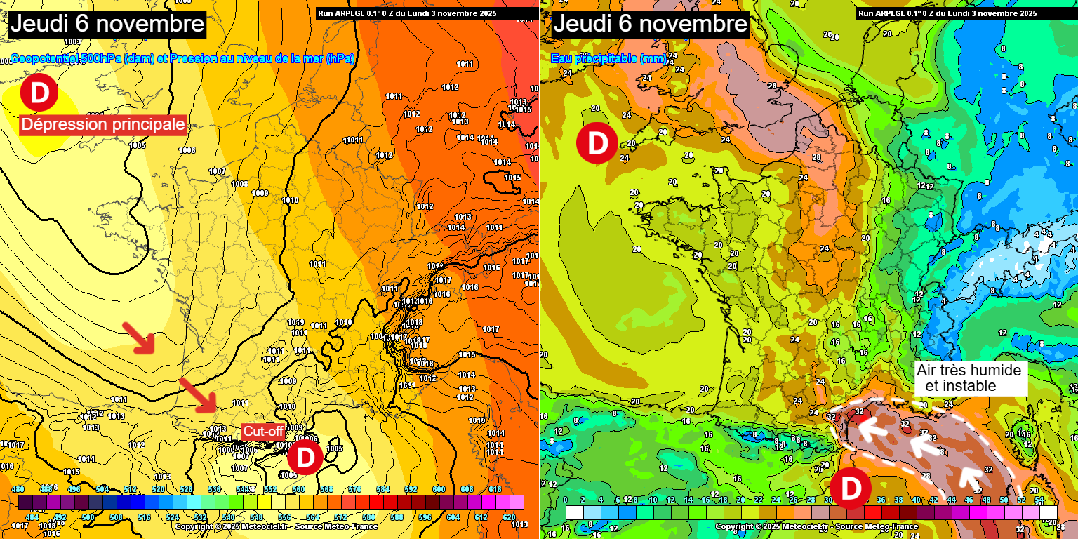 En effet, en marge d'une vaste zone dépressionnaire circulant sur l'Atlantique, un petit cut-off va s'étendre jusqu'à la Méditerranée entre jeudi 6 et vendredi 7 novembre, apportant de nouveau des conditions plus humides sur une partie de la France.