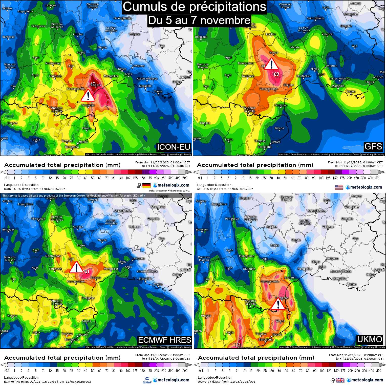 Comparaison de différents modèles concernant le risque d'importants cumuls de pluie sur l'Occitanie le 6 novembre prochain – via meteologix