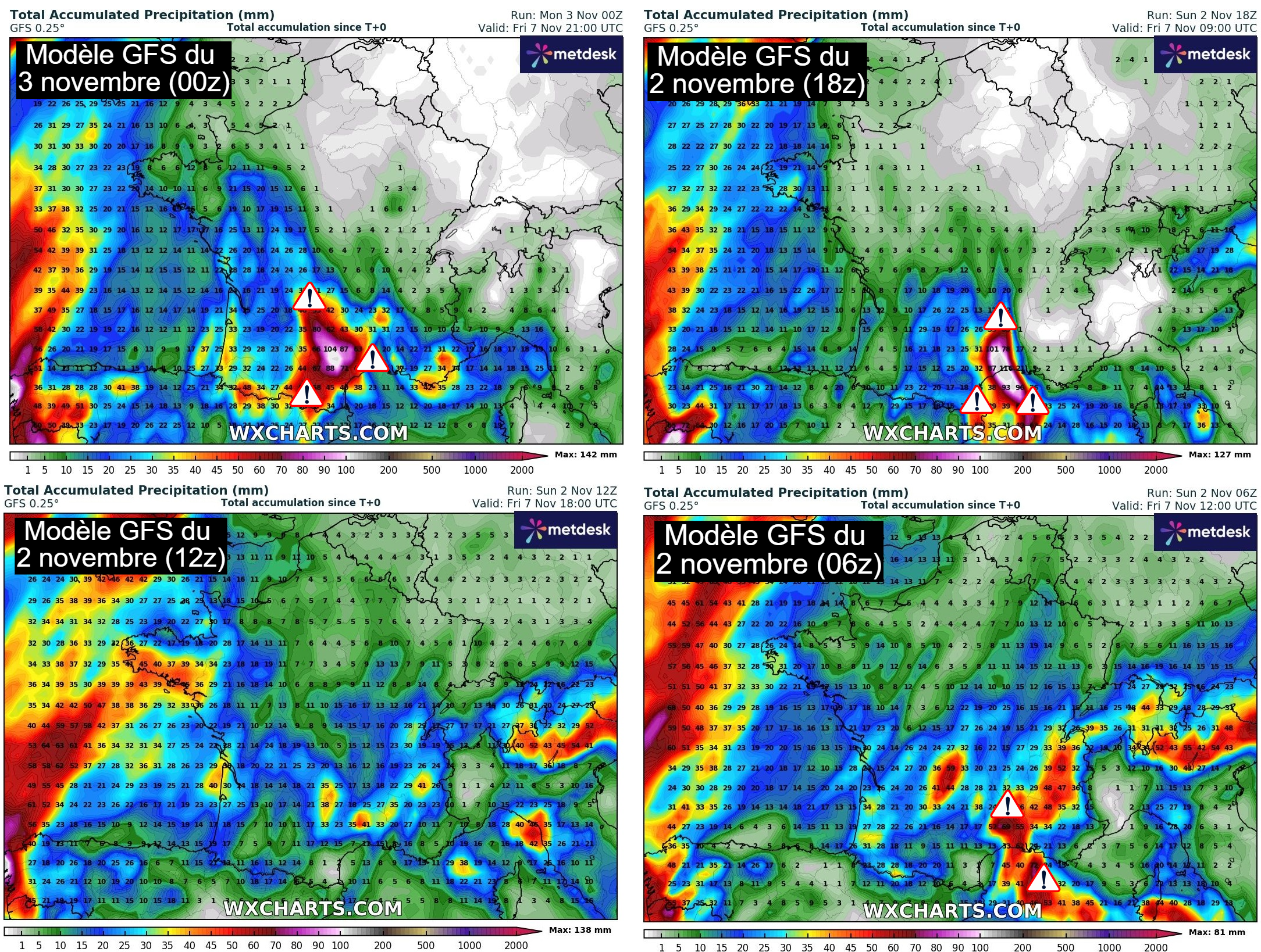 Il conviendra donc de surveiller la situation sur ces secteurs en journée du 6 novembre, le risque d'épisode pluvio-orageux potentiellement notable étant aujourd'hui prévu comme significatif. Les prévisions pourront toutefois évoluer, l'évolution de ce type de goutte froide étant difficile à appréhender avec précision à plusieurs jours de l’événement, en témoignent les dernières réactualisations du modèle GFS.