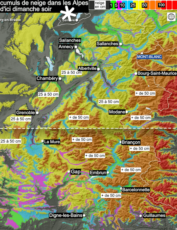 Couche de neige fraîche, attendue d'ici dimanche soir sur les Alpes - modèle météo GFS via Allosurf