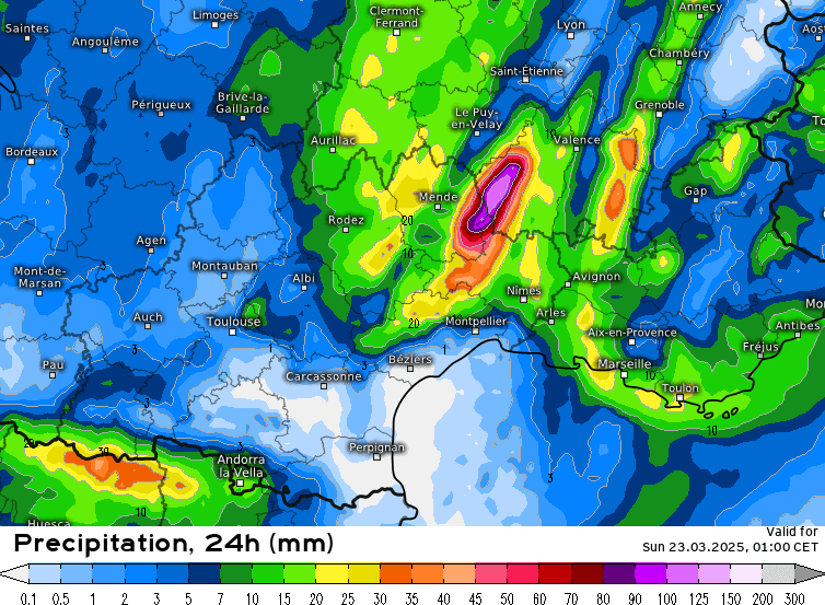 C'est dans les Cévennes que les précipitations seront les plus actives et persistantes ce samedi 22 mars 2025. Certains scénarios envisagent des cumuls sur 24 heures pouvant atteindre la barre des 100 mm entre les Cévennes lozériennes et ardéchoises, comme le montre la carte ci-dessous du modèle allemand. Il conviendra de surveiller ces pluies orageuses.