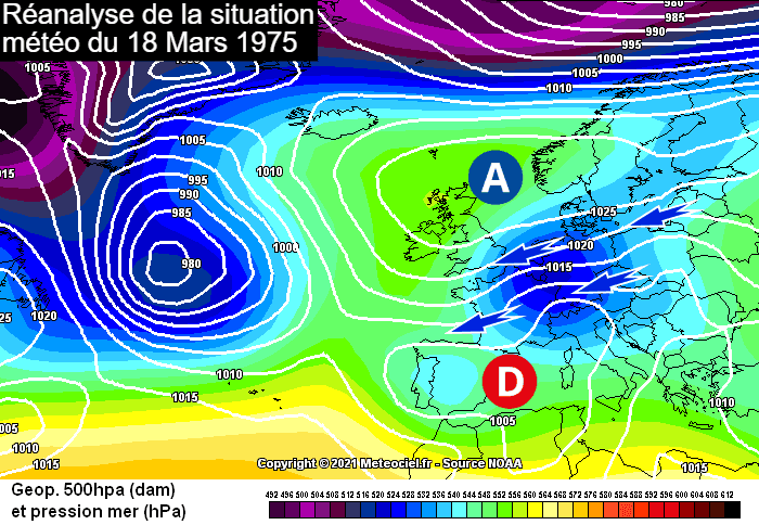 À l'époque, la France vit son hiver le plus doux jamais observé ! L'hiver 1974-1975 enregistre une température moyenne de 7,35°C en France. Seul l'hiver 1989-1990 viendra le surpasser (7,62°C) au XXème siècle. On parle alors d'année sans hiver avec une douceur qui domine largement décembre, janvier et février. Et pourtant, une coulée d'air froid plonge sur la Scandinavie à la mi-mars 1975 et celle-ci est ensuite propulsée vers la France par un flux continental piloté par un anticyclone britannique. Ce froid nous arrive sous la forme d'une goutte froide qui s'accompagne aussi d'humidité. Ainsi, la neige s'invite.