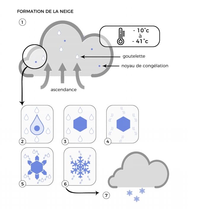 Schéma du mécanisme de formation de la neige - tiré de la page 56 du livre METEO EXTREME