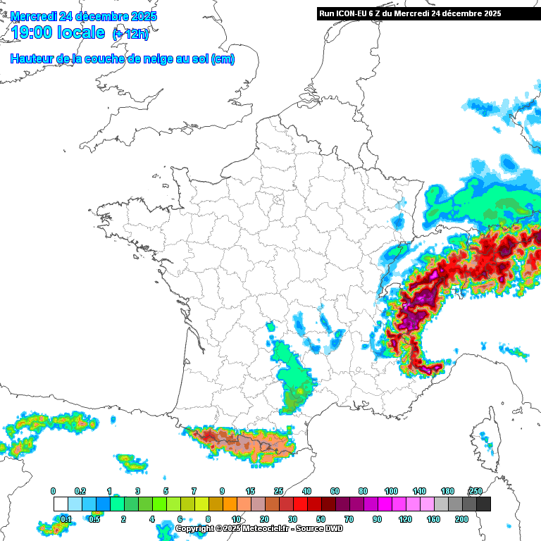 Prévision et évolution de la couche de neige au sol entre mercredi 24 décembre à 19h et jeudi 25 décembre à midi - modèle ICONE