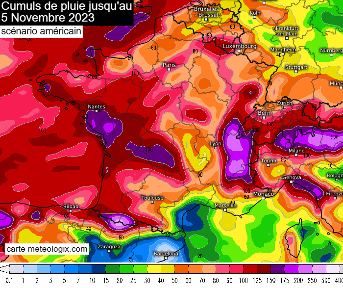 Cumuls de pluie prévus jusqu'au dimanche 5 novembre 2023 selon le modèle américain – via meteologix.com