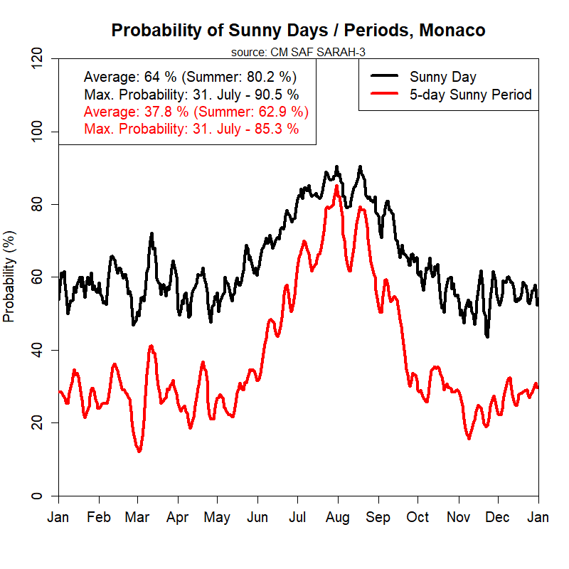 Probabilité d'ensoleillement (>5 jours consécutifs) à Monaco - CM SAF data