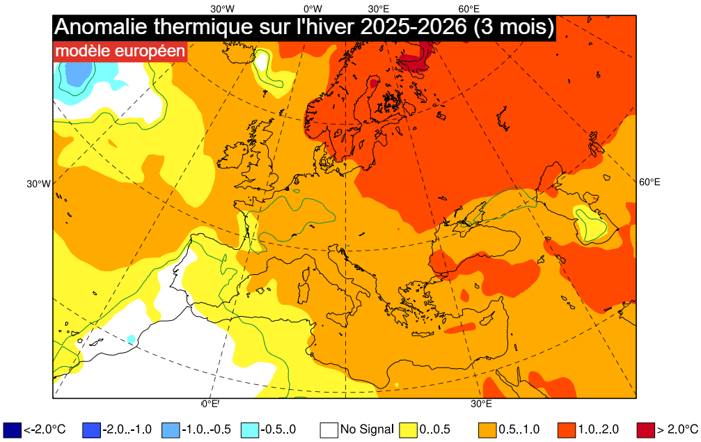 Le modèle saisonnier européen se rapproche fortement de son homologue américain. Il envisage un hiver 2025-2026 plus doux que la normale sur l'Europe, bien qu'il projette une anomalie plus importante sur le nord et l'est du continent, notamment en Scandinavie. Sur la France, l'anomalie sur les trois mois de l'hiver serait de l'ordre de +0,5 à +0,75°C, des chiffres semblables aux projections du modèle américain. Notons que l'hiver serait simplement de saison en allant vers le Portugal.