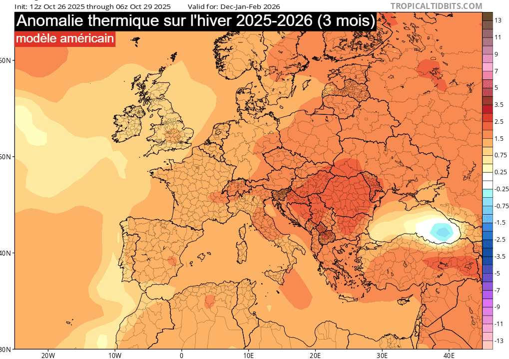 Selon le modèle saisonnier américain, la France - et plus globalement l'Europe - devraient assister à un hiver 2025-2026 plus doux que la normale. La moyenne des trois mois de l'hiver météorologique (décembre, janvier et février) donne un excédent proche de +0,75°C sur la France. L'hiver serait donc globalement plus doux que la normale mais l'anomalie ne serait pas aussi prononcée que lors des hivers remarquablement doux qu'a pu connaître la France (+2,7°C en 2019-2020).
