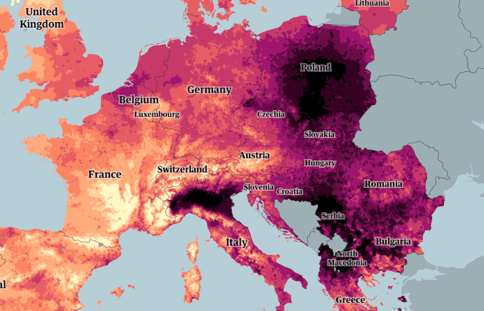 Cette carte permet de visualiser en un coup d'oeil les zones où la qualité de l'air est la plus dégradée en Europe. La Pologne, les pays des Balkans et le nord de l'Italie sont particulièrement touchés par la pollution de l'air. Ces zones affichent des taux moyens de particules fines dans l'air jusqu'à plus de 4 fois supérieurs aux recommandations de l'OMS ! Le nord de la France n'est pas très bien loti. À l'inverse, le nord de l'Europe (Islande, Scandinavie) profitent d'une très bonne qualité de l'air.